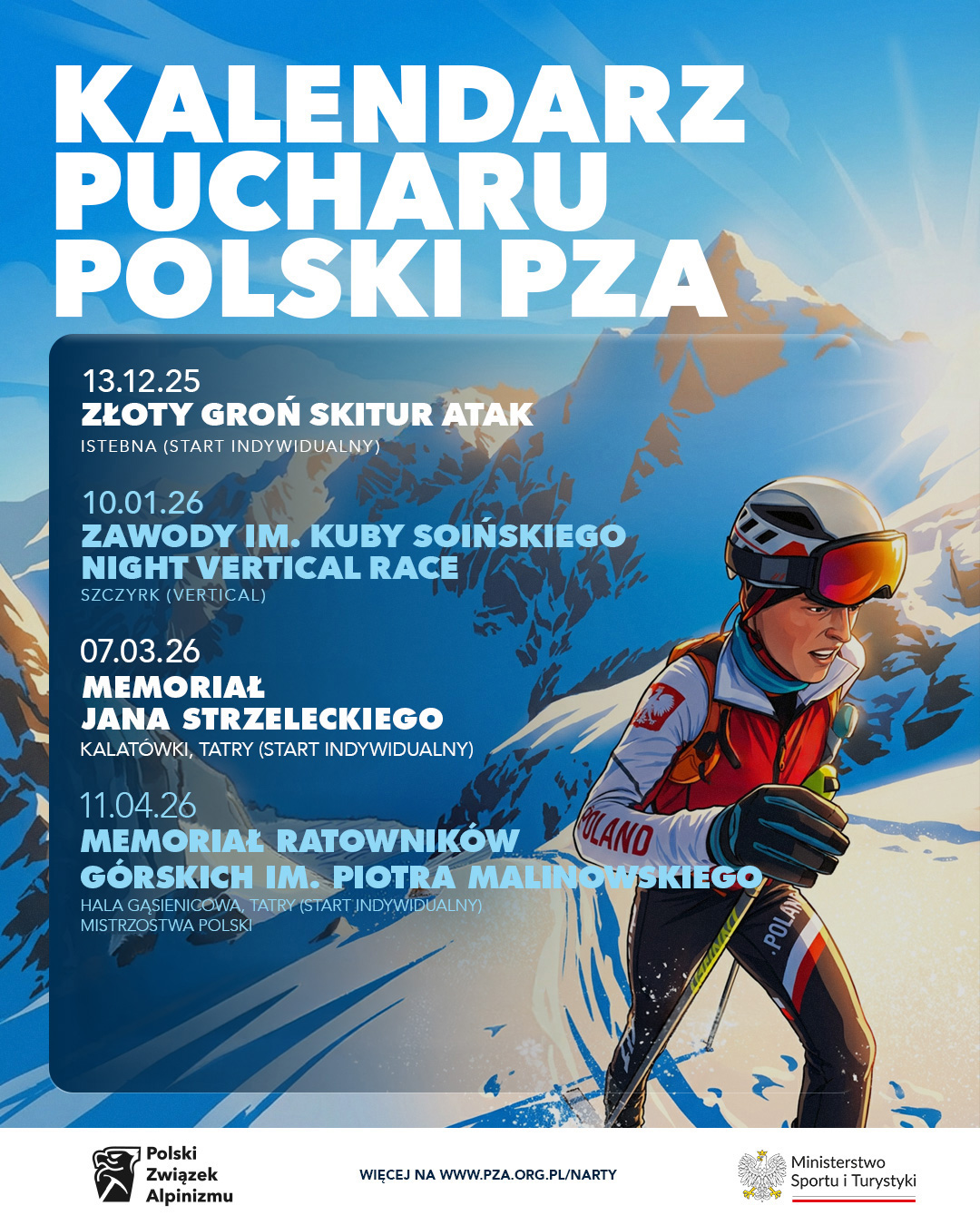 Złoty Groń Skitur Atak zainauguruje Puchar już 13 grudnia, w rejonie stoków narciarskich w Istebnej. To świetne zawody na początek zimy: dużo przepinek, łatwe zjazdy i można sprawdzić, jak przepracowało się lato i jesień. Organizatorem jest KS Kandahar, który przygotował także styczniowe i lutowe starty na verticalu w Szczyrku i na Pucharze Pilska (w randze zespołowych Mistrzostw Polski). Końcem lutego lub na początku marca przeniesiemy się w Tatry. W tym sezonie KW Kraków zaprasza na Memoriał Strzeleckiego z bazą w Schronisku Kalatówki i trasą w rejonie Kopy Kondrackiej. Jeśli zawody będa mogły być rozegrane 28 lutego, odbędą się w randze indywidualnych Mistrzostw Polski. Jeśli ze względów organizacyjnych będą przeniesione na termin 7 marca, rangę Mistrzostw Polski otrzymają ostatnie zawody sezonu. Memoriał Ratowników Górskich im.Piotra Malinowskiego został zaplanowany w połowie kwietnia na kultowej trasie prowadzącej przez pięć przełęczy, z bazą w Schronisku Murowaniec, organizowany przez klub TKN Tatra Team.